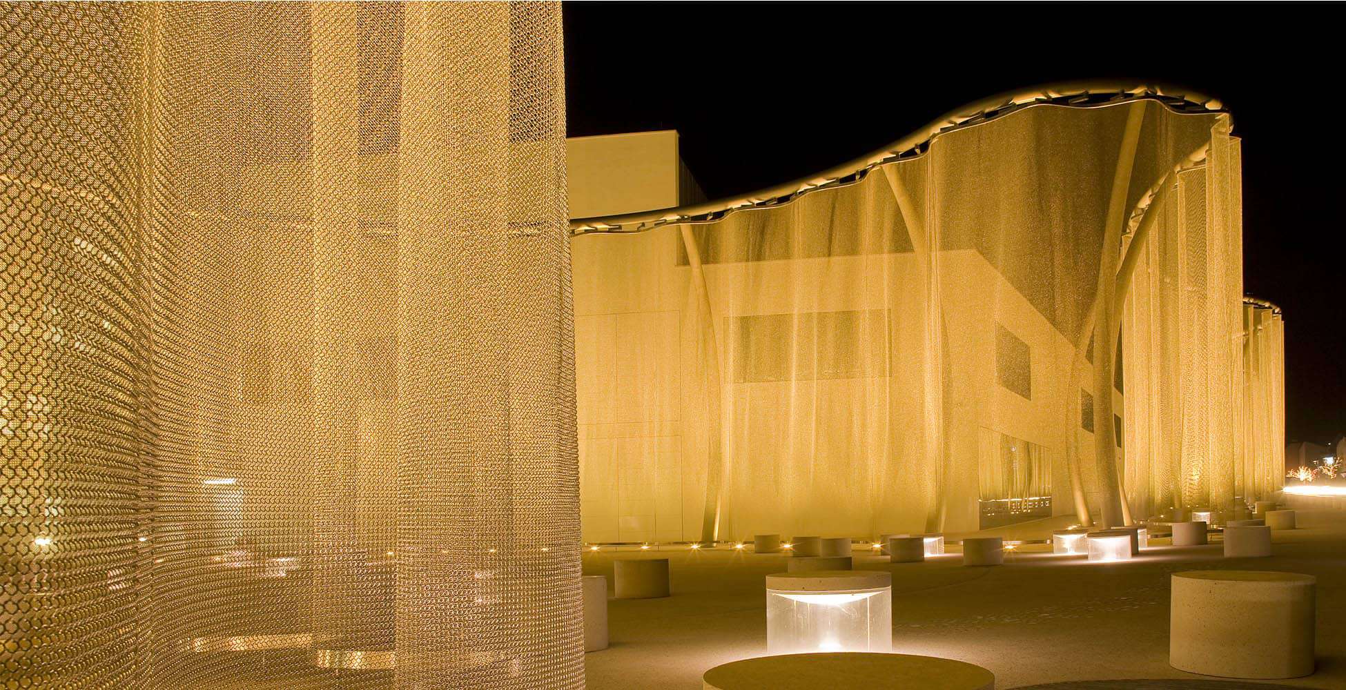 The alphamesh curtain is composed of more than 26 million individual welded rings and encloses the premises like a work of art. With a height of 10m, the curtain meanders along